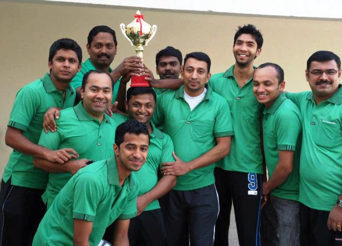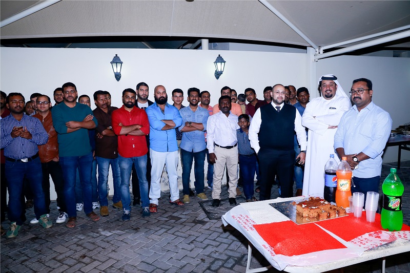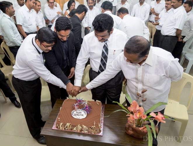 Cake cutting by Mr. Dhiraj K. (Manager-Marketing), Mr. Hafiz Hassan (Financial Controller), Mr. John Thomas (Managing Director) and Mr. Santhosh T. Kuruvilla (Executive Director & General Manager) on achieving the target